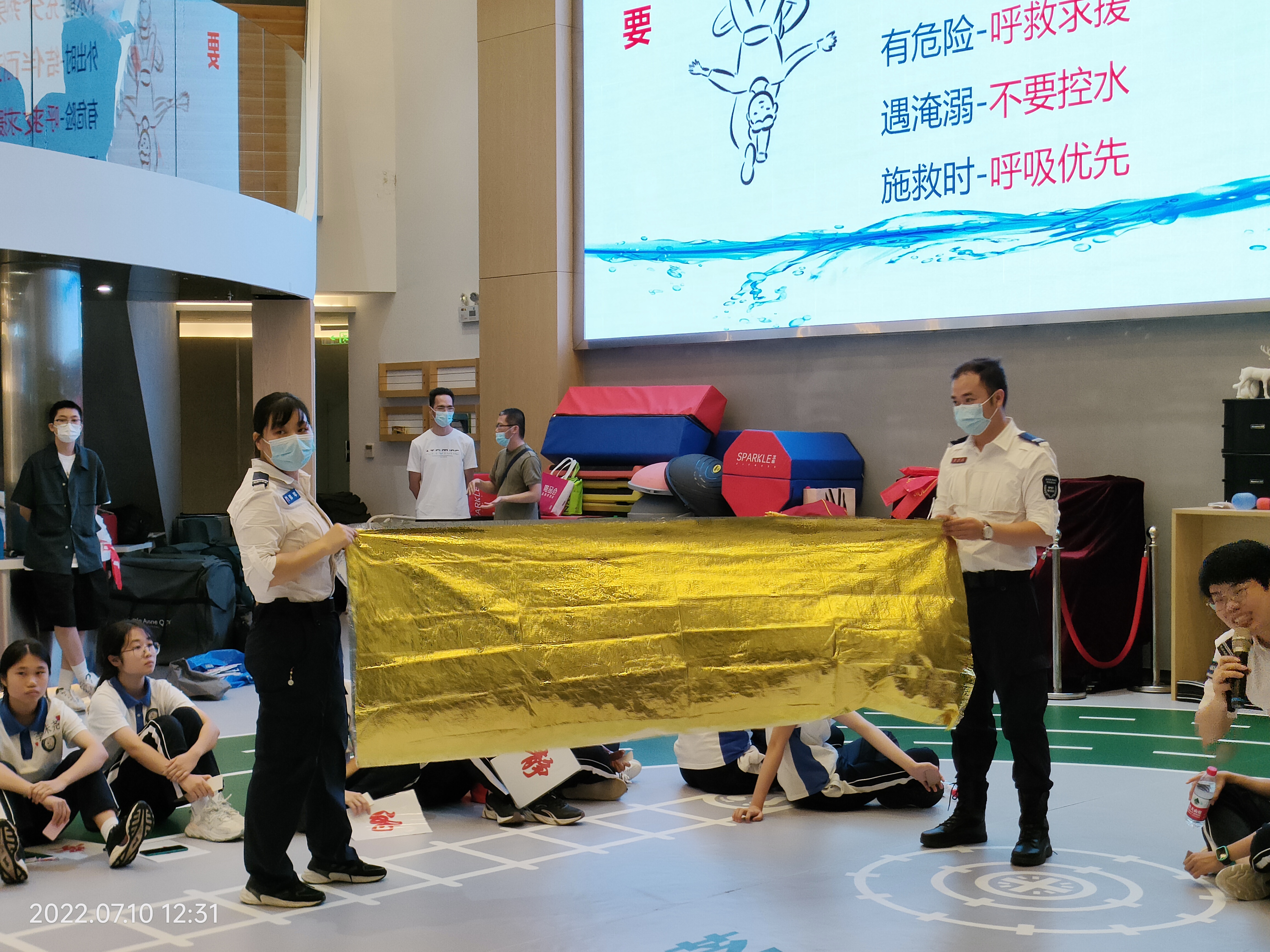 初中二年级的四十多位中学生在这里,由八位志愿者教官带领着完成了一场以多个即兴戏剧主题的急救知识学习。而另外两所医院的十来位医护人员因为疫情的关系,没有办法来到现场教学,他们也通过现场主导教学的SK认证讲师郑冰,向同学们表达了问候和勉励。