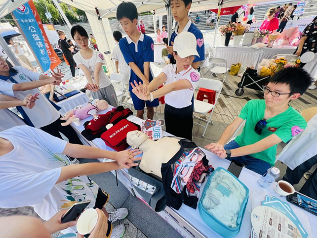 粤美特慈善基金会在现场从事应急救护科普工作,急救导师为现场青少年志愿者开展急救教学,并参与公共服务,协助会务安全。