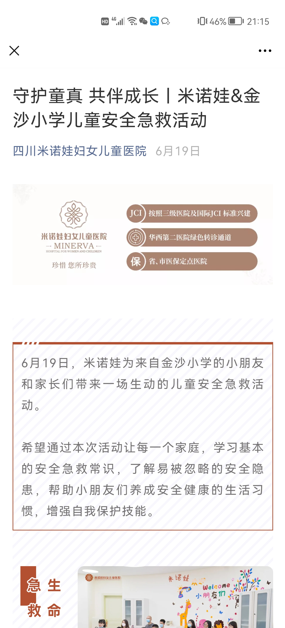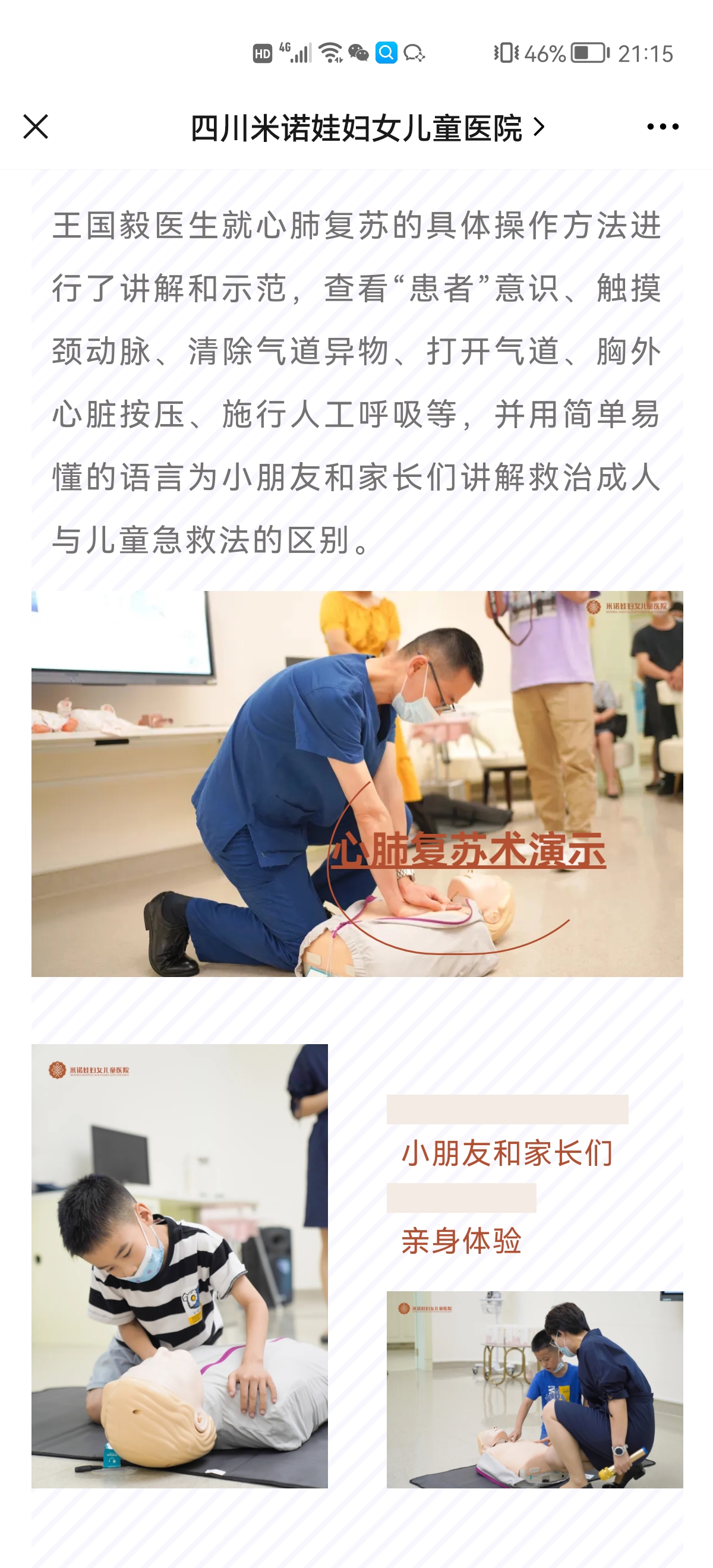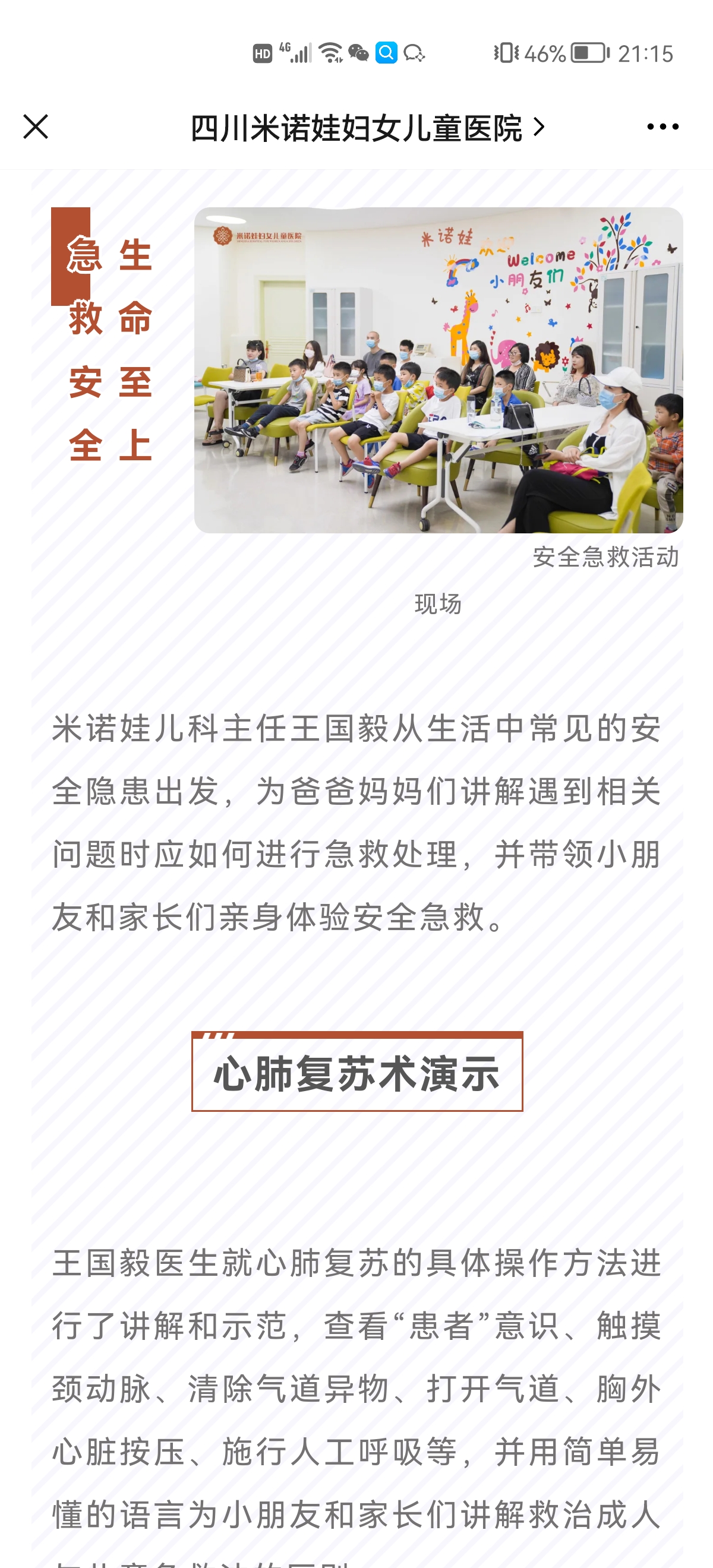 简介:6月19日王国毅主任为来自金沙小学的小朋友和家长带来一场生动的儿童安全急救培训课,小朋友和家长们学习了成人和儿童的心肺复苏及海姆利克急救法,帮助小朋友们养成安全健康的生活习惯,增强了自我保护技能。