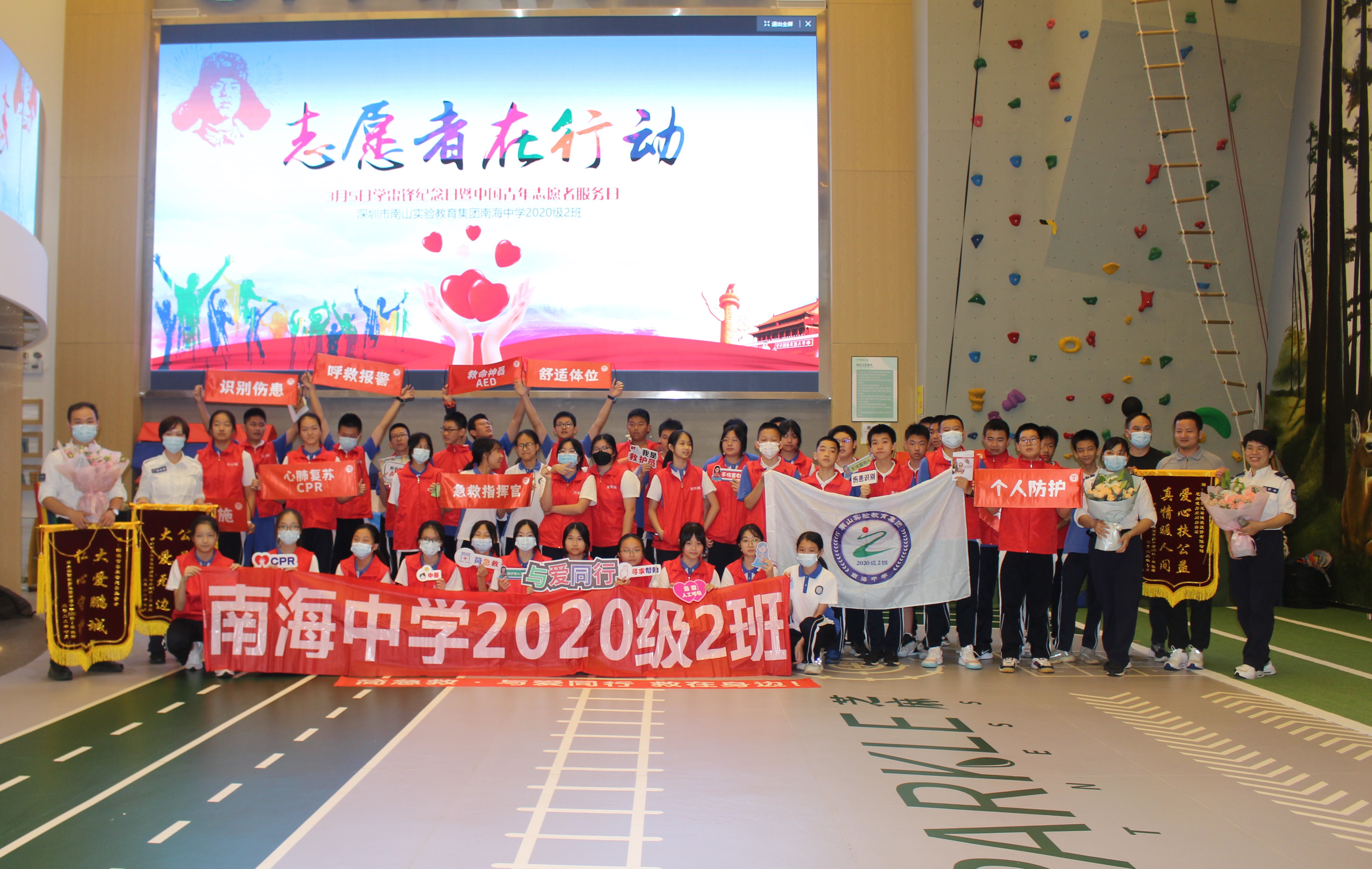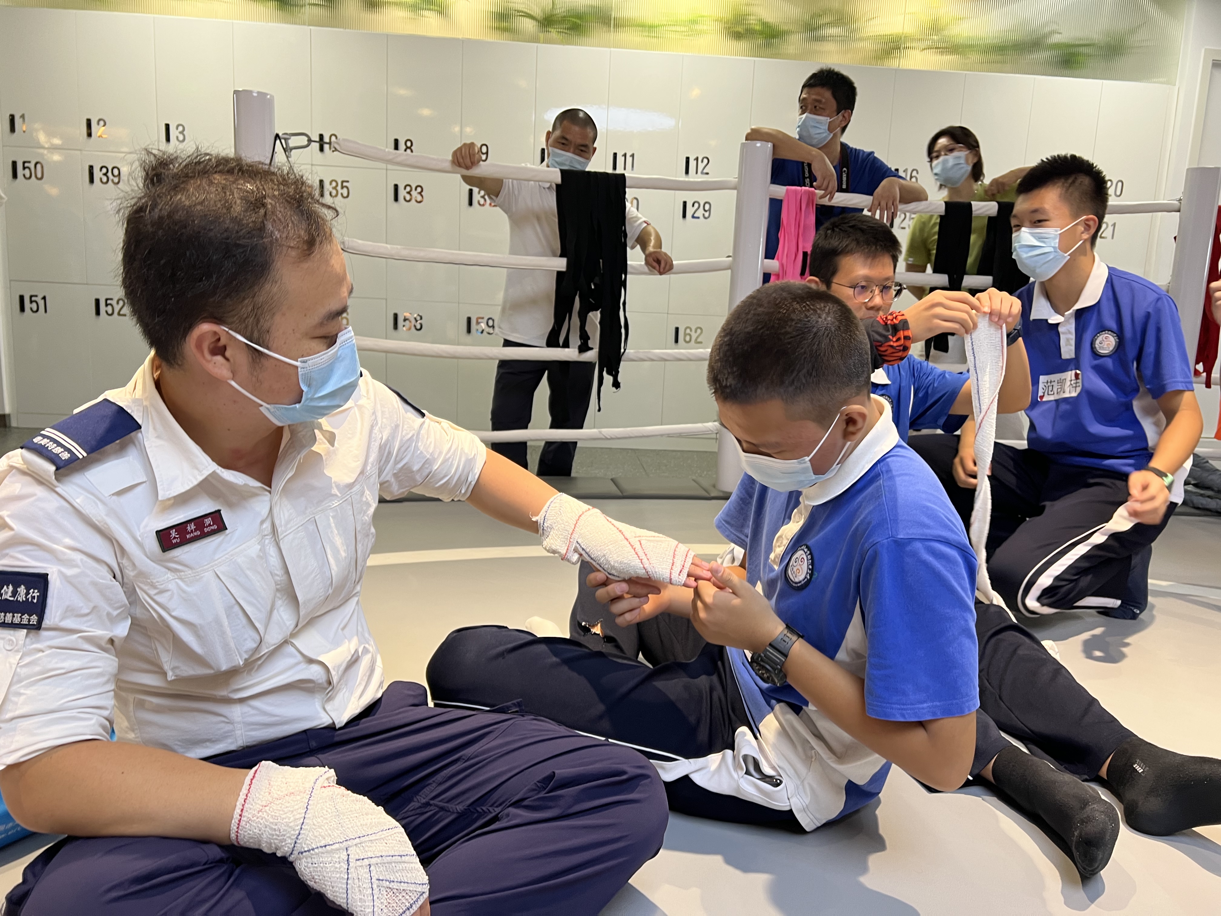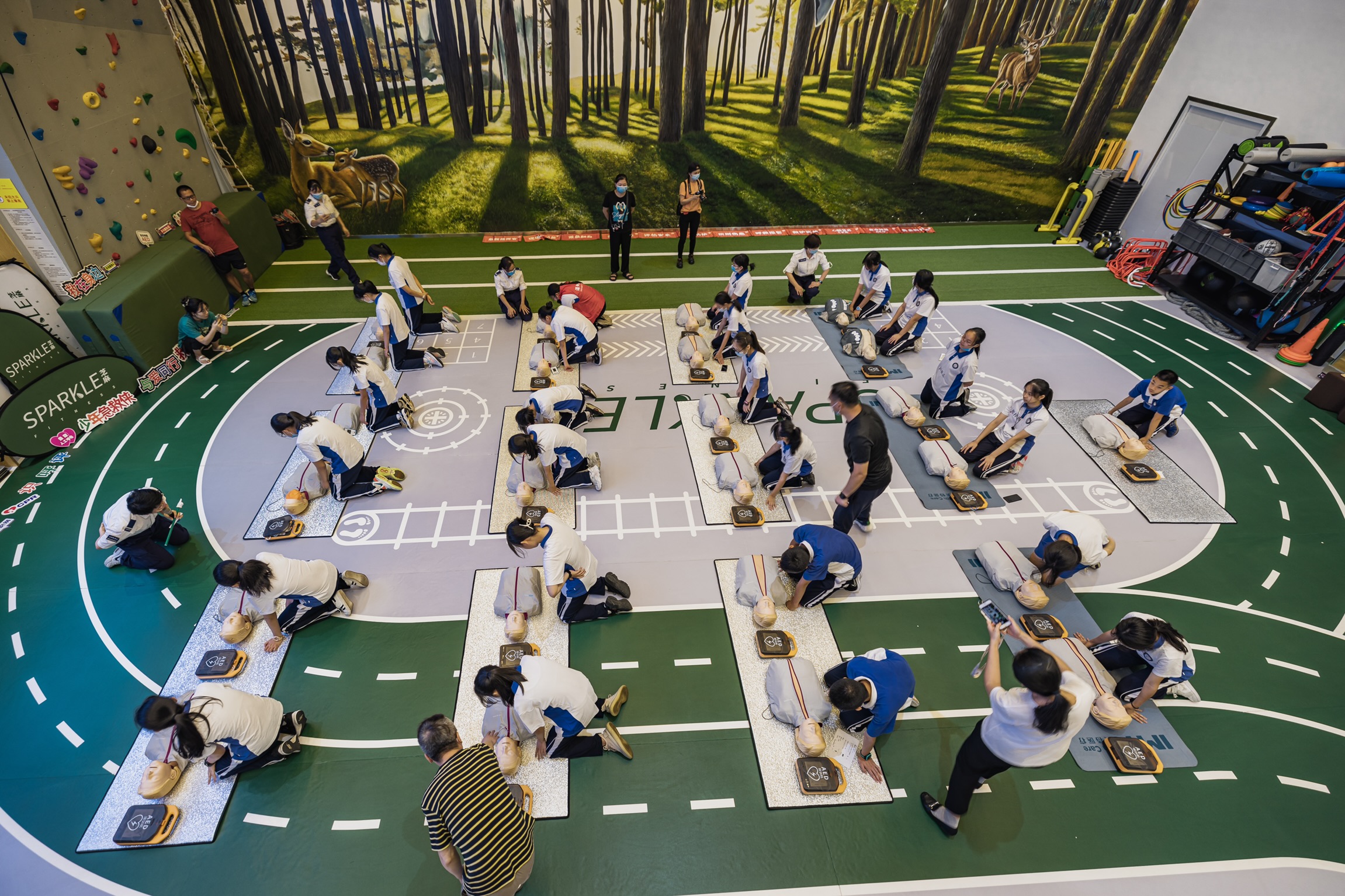 初中二年级的四十多位中学生在这里,由八位志愿者教官带领着完成了一场以多个即兴戏剧主题的急救知识学习。而另外两所医院的十来位医护人员因为疫情的关系,没有办法来到现场教学,他们也通过现场主导教学的SK认证讲师郑冰,向同学们表达了问候和勉励。