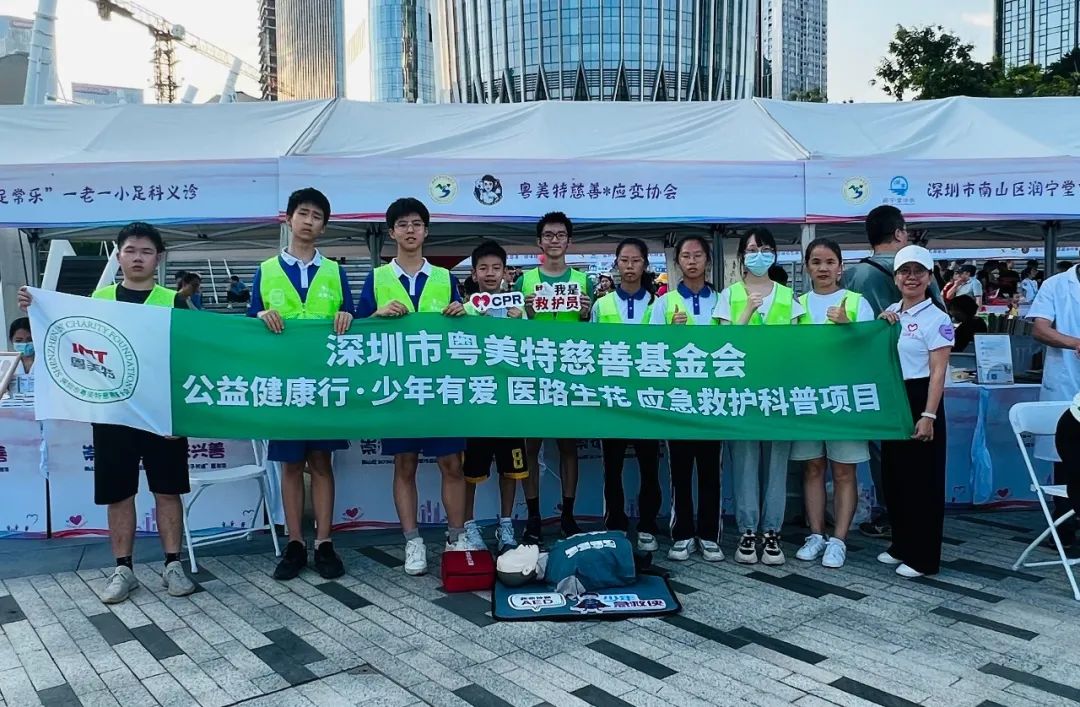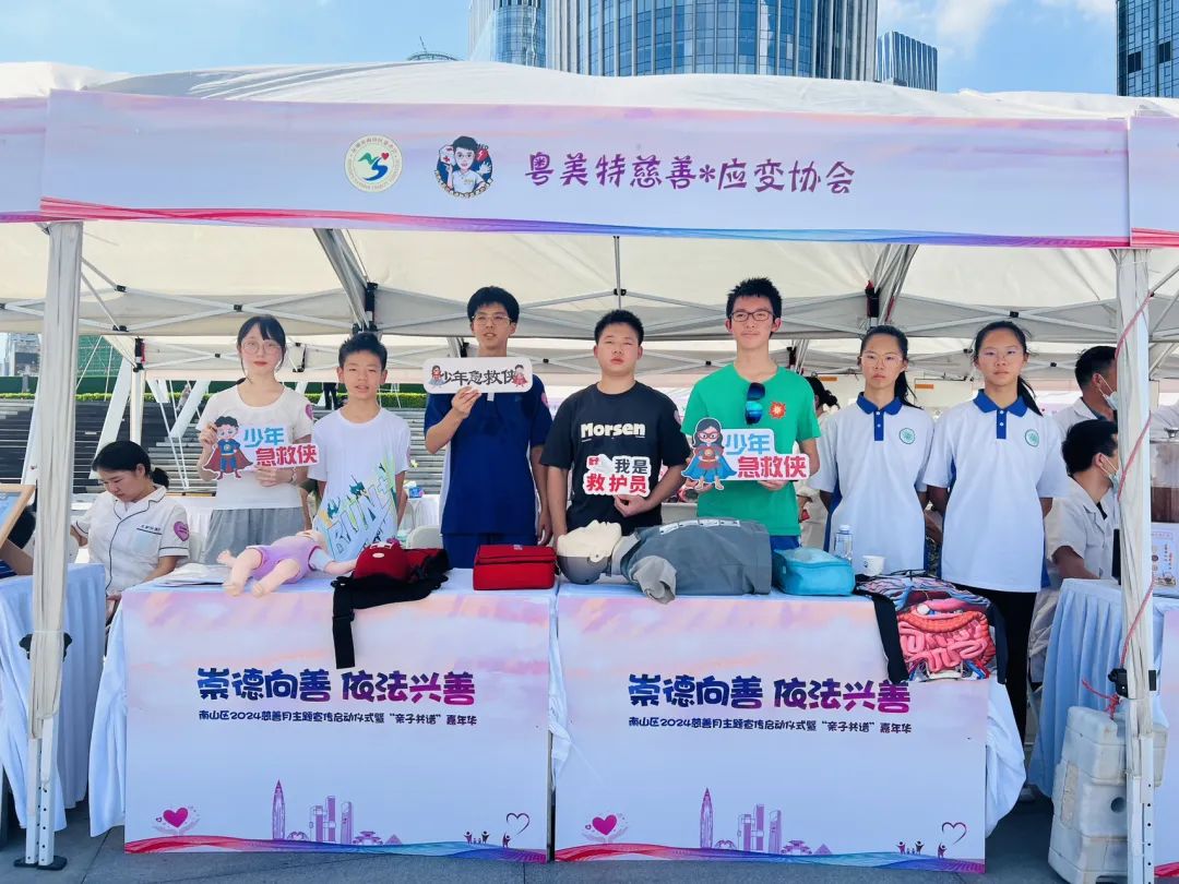 粤美特慈善基金会在现场从事应急救护科普工作,急救导师为现场青少年志愿者开展急救教学,并参与公共服务,协助会务安全。